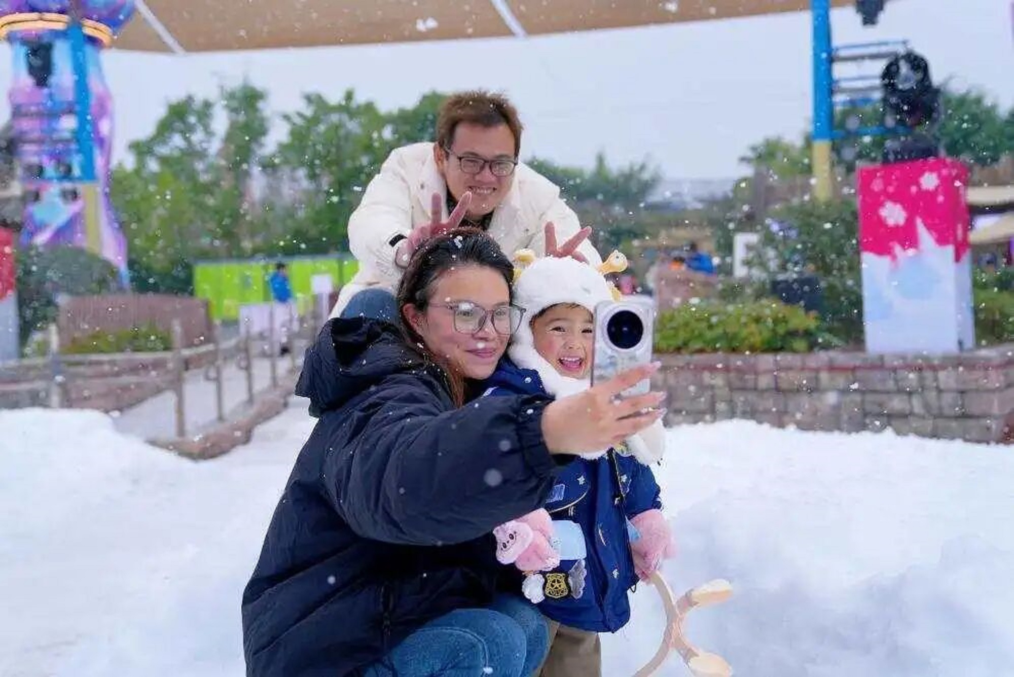 此外,“白+黑”主題巡游輪番上演,白天機械恐龍花車互動、夜晚熒光主題巡游,帶來雙重視覺樂趣。跨年夜零點前夕,1000架無人機演繹動態(tài)圖案,全場游客齊聲倒計時,伴隨迎新煙花秀點亮夜空,在歡呼與尖叫中開啟2026年,圓滿實現(xiàn)一場全民共享的歡樂跨年盛典。