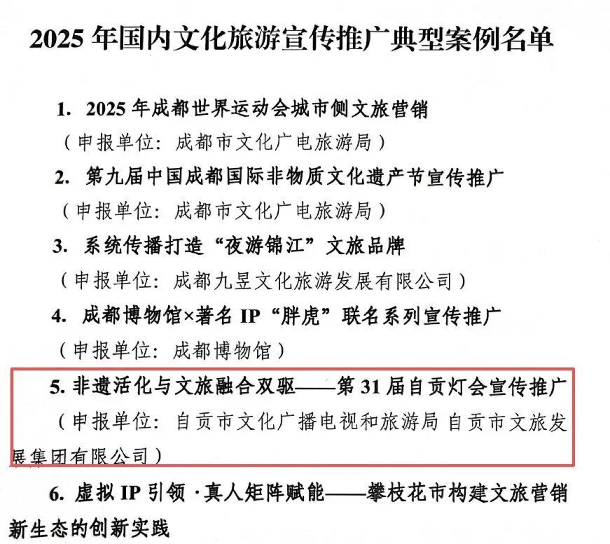 近日,在文化和旅游廳組織開展的2025年國內(nèi)文化旅游宣傳推廣典型案例評選活動中,由自貢市文化廣播電視和旅游局、自貢市文旅發(fā)展集團有限公司選送的“非遺活化與文旅融合雙驅(qū)——第31屆自貢燈會宣傳推廣”宣傳推廣案例,成功被列入2025年國內(nèi)文化旅游宣傳推廣典型案例名單。