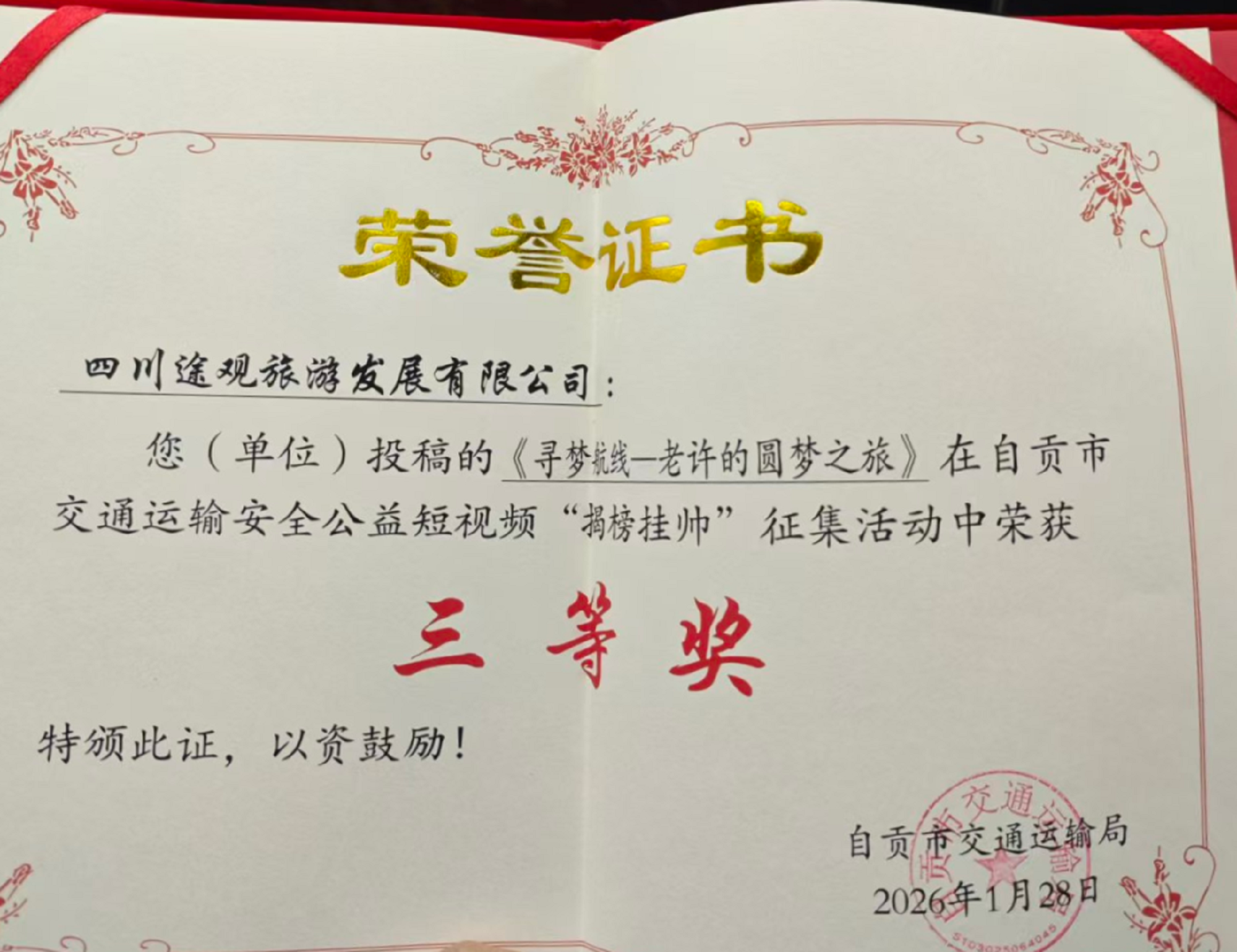 自貢市交通運輸局“交通運輸安全公益短視頻”大賽評選結果正式揭曉。市文旅發(fā)展集團精心拍攝制作的公益視頻《文明自貢·禮遇同行》憑借貼合主題的內容呈現與細膩的創(chuàng)作表達,榮獲大賽一等獎;集團旗下四川途觀旅游發(fā)展公司的參賽作品《尋夢航線——老許的圓夢之旅》,以生動的敘事傳遞安全理念,收獲三等獎。